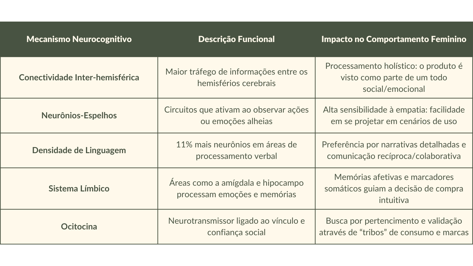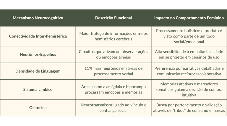 Abaixo, detalha-se a estrutura neuroquímica e cognitiva que diferencia os processos de decisão, evidenciando a inclinação feminina pelo processamento holístico: