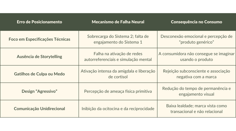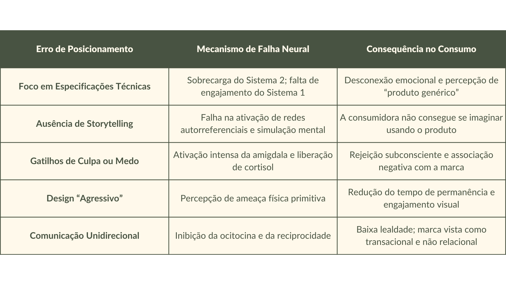 Abaixo, descrevem-se os principais erros estratégicos identificados na comunicação de marcas e suas repercussões neurais: