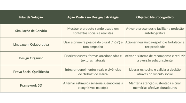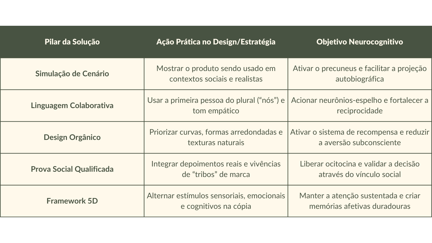 Para reverter esse quadro e alinhar a estratégia de marca à arquitetura neural feminina, é necessário implementar um design centrado na criação de "cenários de transformação". O guia prático para essa implementação baseia-se na substituição do discurso transacional pela narrativa relacional e multissensorial. A primeira etapa consiste na utilização da Escrita 5D para estruturar mensagens que acionem o sistema límbico e promovam a liberação de ocitocina (vínculo) e dopamina (motivação). O design deve priorizar a Dimensão Sensorial, utilizando imagens e palavras que descrevam texturas, aromas e sensações de conforto, permitindo que a consumidora simule corporalmente a experiência de uso antes da compra real.