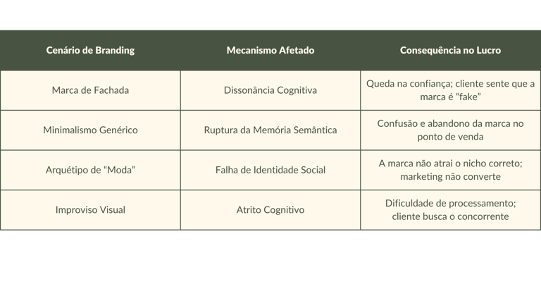 O diagnóstico mais crítico da atualidade é o fim das "Marcas de Fachada". O erro fundamental das marcas presas no passado é tentar projetar imagens de mercado que não condizem com a essência de seus fundadores, gerando o que a psicologia chama de Dissonância Cognitiva. Quando um fundador com pavor de risco tenta gerir uma marca sob o arquétipo do Fora da Lei, a quebra de expectativa causa um desconforto subconsciente que interrompe a venda imediatamente. O cliente percebe essa "mentira" invisível e se afasta, pois o cérebro busca padrões de segurança que não são encontrados na inconsistência.